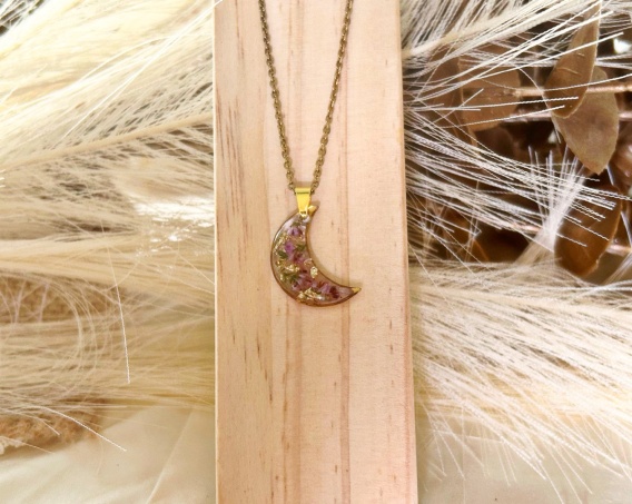 Elegancki naszyjnik z żywicy jubilerskiej w kształcie księżyca, w którym zatopione zostały prawdziwe suszone wrzosy. To unikatowa, ręcznie robiona biżuteria z kwiatami, która łączy w sobie subtelną naturalność i ponadczasową elegancję. Każdy egzemplarz jest wyjątkowy i jedyny w swoim rodzaju – idealny dla kobiet ceniących niepowtarzalne dodatki.