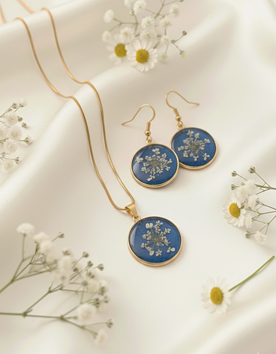 Poznaj unikalny komplet biżuterii ręcznie robionej, który łączy w sobie elegancję i magię natury. W skład zestawu wchodzi długi naszyjnik (60 cm) oraz kolczyki na wygodnych biglach angielskich, ozdobione okrągłymi medalionami z zatopionymi w żywicy jubilerskiej kwiatami dzikiej marchwi.