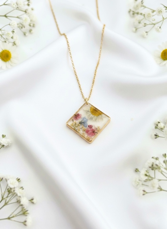 Ręcznie robiony naszyjnik z prawdziwymi kwiatami – stokrotką, dziką marchwią, gipsówką i niezapominajką, zatopionymi w krystalicznie czystej żywicy jubilerskiej. Delikatny kwadratowy wisiorek w złotej oprawie tworzy unikalną kompozycję natury, zamkniętą na zawsze w eleganckiej formie biżuterii. Każdy naszyjnik powstaje w 100% ręcznie, dzięki czemu jest absolutnie niepowtarzalny – nie ma dwóch identycznych egzemplarzy.