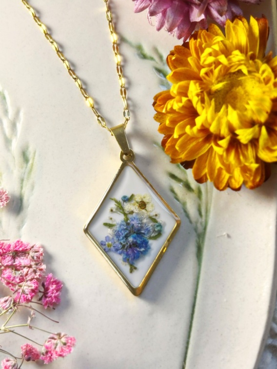Każdy kwiat został ułożony ręcznie, a następnie zamknięty w krystalicznie przejrzystej żywicy, dzięki czemu zachowuje swój naturalny kształt, kolor i delikatność. To biżuteria z żywicy premium, która sprawia wrażenie drobnego obrazu botanicznego zawieszonego na szyi — elegancka, niepowtarzalna, pełna charakteru.