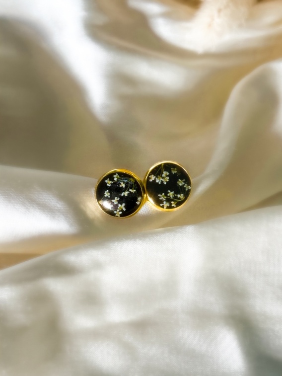Ręcznie robione kolczyki wkrętki z prawdziwymi kwiatami dzikiej marchwi zatopionymi w krystalicznie czystej żywicy jubilerskiej. Delikatne, białe kwiaty na czarnym tle w złotej oprawie tworzą elegancki kontrast, podkreślając naturalne piękno roślin. To wyjątkowa biżuteria artystyczna handmade, w której natura spotyka się z ponadczasową klasyką.
