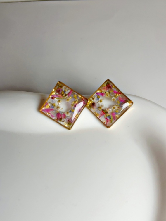 Kwadratowa forma nadaje kolczykom nowoczesny charakter, a naturalne kwiaty wprowadzają lekkość i romantyczny klimat. To kolczyki handmade z kwiatami, które łączą elegancję z inspiracją naturą.