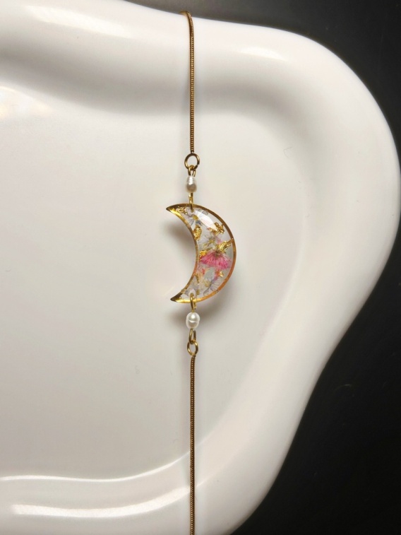 Zawieszka w kształcie półksiężyca została ręcznie wykonana z żywicy jubilerskiej, w której zatopiono prawdziwe, suszone kwiaty. Każdy egzemplarz jest niepowtarzalny — układ kwiatów może się delikatnie różnić, co podkreśla autorski charakter biżuterii marki Blask Natury. Całość dopełnia subtelna perełka, nadająca bransoletce elegancji i lekkości.