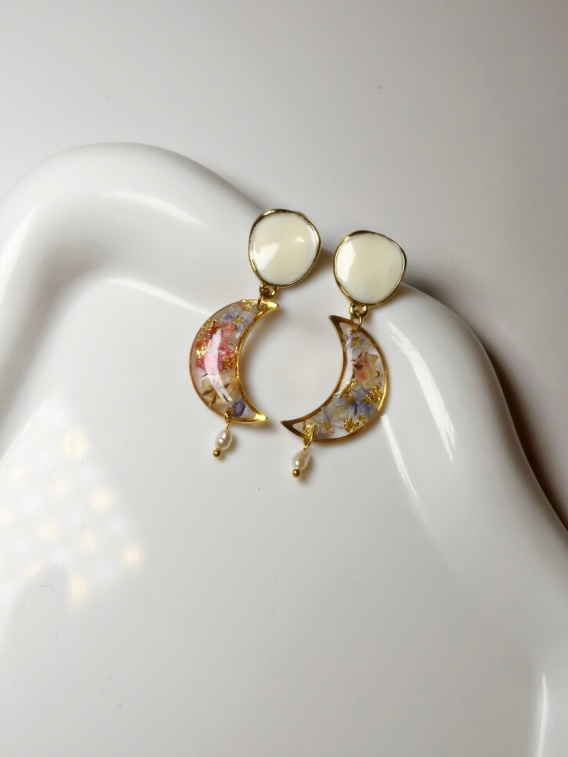 Kolczyki z naturalnymi kwiatami i perełkami – księżyc | Blask Natury