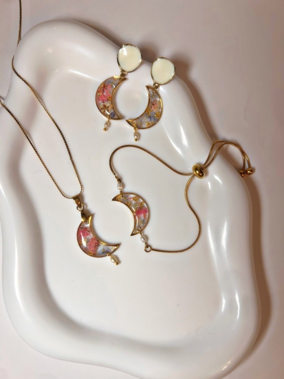 Subtelny, a jednocześnie wyjątkowy komplet biżuterii handmade z naturalnymi kwiatami i perełkami to propozycja dla kobiet, które kochają delikatność natury zamkniętą w eleganckiej formie. Motyw księżyca symbolizuje kobiecość, harmonię i wewnętrzny spokój, czyniąc ten zestaw idealnym dodatkiem zarówno na co dzień, jak i na wyjątkowe okazje.