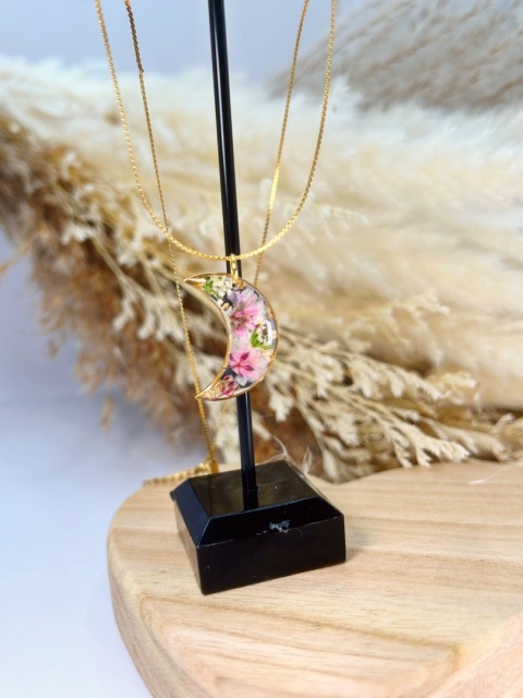Złoty naszyjnik księżyc z zatopionymi kwiatami – lekka elegancja natury