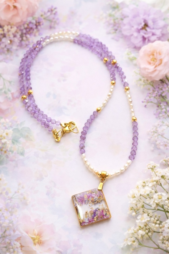 Całość dopełniają perły słodkowodne, wprowadzające nutę klasycznej elegancji i miękkiego, perłowego blasku. Centralnym elementem naszyjnika jest ręcznie wykonana zawieszka z żywicy, w której zatopione zostały drobne, naturalne kwiaty, tworzące efekt miniaturowego, zaczarowanego ogrodu zamkniętego w geometrycznej formie. Subtelne złocenia dodają kompozycji luksusowego charakteru i pięknie kontrastują z fioletem ametystu.